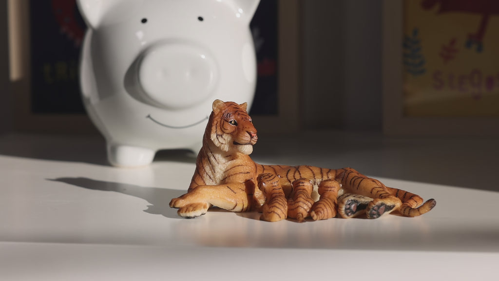 This Papo figurine realistically and gently depicts a lying tigress nursing her baby: detailed tabby fur, a restful posture, and a moving maternal bond. A unique piece to complete a collection of wild animals, invent tender stories, or educate children about the lives of endangered big cats.